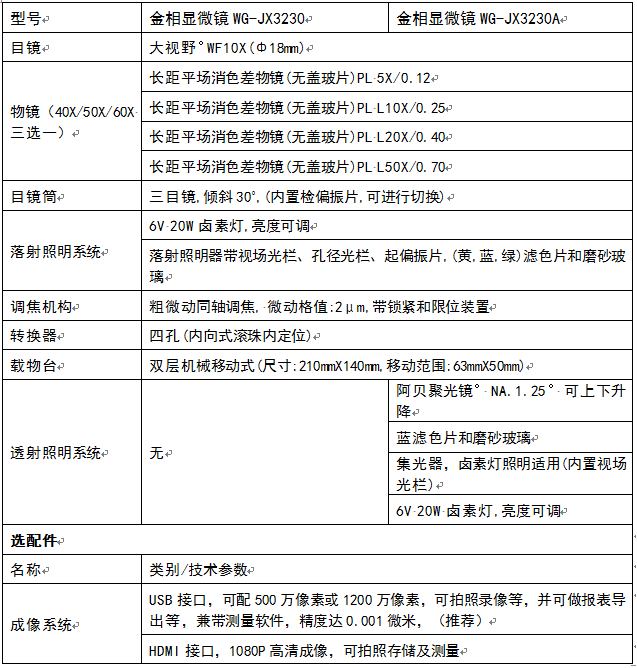 菜單產品中心Product center 金相顯微鏡 半導體金相顯微鏡金屬材料分析金相顯微鏡導電粒子金相顯微鏡偏光暗場金相顯微鏡倒置金相顯微鏡正置金相顯微鏡明暗場 研究級金相顯微鏡 視頻顯微鏡 4K超清測量顯微鏡自動對焦顯微鏡高清測量顯微鏡高清視頻顯微鏡三維顯微鏡全高清紅外/紫外顯微鏡特殊功能顯微鏡 刀具檢測儀 生物顯微鏡 數碼生物顯微鏡熒光生物顯微鏡 體視顯微鏡 顯微鏡配件 金相顯微鏡輔且 熱門產品 →正置金相顯微鏡 WG-BH200M→正置金相顯微鏡 WG-JX3233D→正置金相顯微鏡 MX4R 返回您的位置:首頁 → 產品中心 → 金相顯微鏡 → 正置金相顯微鏡 金相顯微鏡WG-JX3230/3230A類別:正置金相顯微鏡 簡介:WG-JX3230/3230A正置透反射顯微鏡適用于對不透明物體或者半透明的物體的顯微觀察,采用優良的無限遠光學系統與模塊化功能設計理念,可提供卓越的光學性能與產品系統升級,實現透反射同步或獨立... 在線咨詢 返回列表 產品說明 產品描述 WG-JX3230/3230A正置透反射顯微鏡適用于對不透明物體或者半透明的物體的顯微觀察,采用優良的無限遠光學系統與模塊化功能設計理念,可提供卓越的光學性能與產品系統升級,實現透反射同步或獨立照明,偏光觀察,暗場觀察等功能,產品具有造型美觀,操作方便,圖像清晰等特點,是生物學,金屬學,礦物學,精密工程學,電子學等研究的理想儀器。 相關產品 系統顯微鏡MXFMS 金相顯微鏡WG-JX3230/3230A 金相顯微鏡WG-JX2003/2003A 正置金相顯微鏡 WG-JX3233D